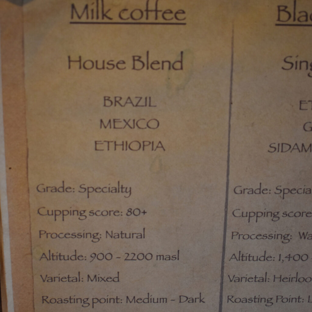 On my first visit, the place was packed. There was a big queue to order, with many already waiting for takeaways and all of the outdoor seating taken. The La Marzocco machine was earning its keep. I ordered a takeaway large oat latte and, while I wasn’t offered a choice of beans, I got the house blend – and the blend was clearly described on the counter.